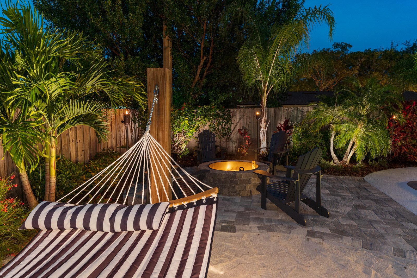 Our designer created separate areas for the backyard resort, dividing it into sections for relaxing by the pool, lounging in a hammock, or enjoying the ambiance under festive string lights.